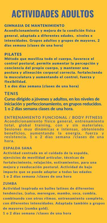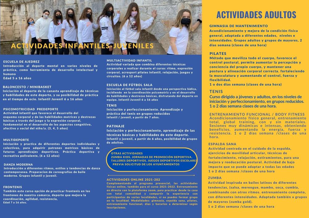 Las actividades se organizan en colaboración con el Ayuntamiento incluyendo una amplia oferta de deportes y actividades físicas para todas las edades: ajedrez, patinaje, tenis, frontenis, fútbol sala, minibasket, danza moderna, multideporte, psicomotricidad, pilates, acondicionamiento físico, entrenamiento funcional, gimnasia de mantenimiento, zumba, espalda sana, multiactividad infantil etc. Cursos y actividades para acercar la actividad física y el deporte a las poblaciones, para que participantes de todas las edades tengan la opción de acceder a los servicios deportivos en su propio municipio, posibilitando la creación de hábitos hacia la práctica físico deportiva como mejora de la salud, bienestar y calidad de vida, promoviendo la incorporación de personas que no realizan ejercicio de forma habitual y destacando la importancia del aspecto socializador de las actividades deportivas grupales, como elemento dinamizador y nexo de unión en los pequeños municipios.